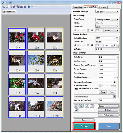 Preview image appears in the preview area. Image is cropped (scan area is specified) automatically according to the film size. Select the frames to scan.