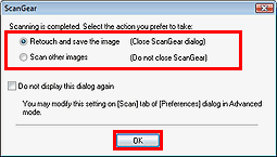 ScanGear's response after scanning can be specified in [Status of ScanGear dialog after scanning] on the [Scan] tab of the [Preferences] dialog box in [Advanced Mode].