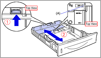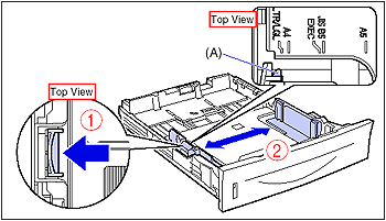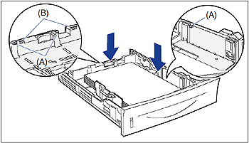 Slide the side paper guides to the size mark for the paper to be loaded.The side paper guides move together. Align the position of (A) with the size mark of the paper to be loaded.