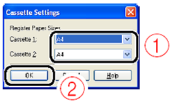 8. Select the size of the paper loaded in the paper cassette (1), then click [OK] (2).