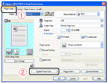 11. Display the [Page Setup] sheet (1), then click [Custom Paper Size] (2).