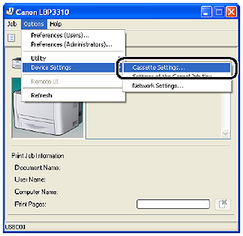 7. From the [Options] menu, select [Device Settings] > [Cassette Settings].