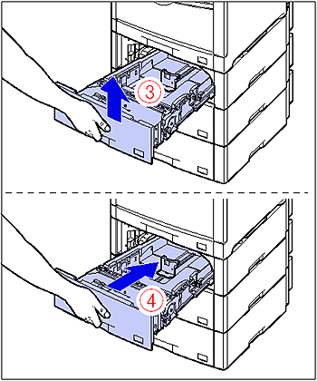 After lifting the front of the paper cassette up a little (3), push the paper cassette into the printer firmly until the front side of the paper cassette is flush with the front surface of the paper feeder (4).