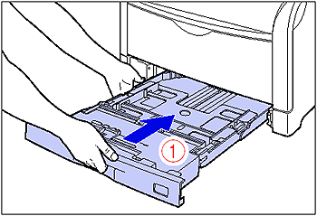 While holding the paper cassette with both hands, insert it until it stops (1) as shown in the figure.