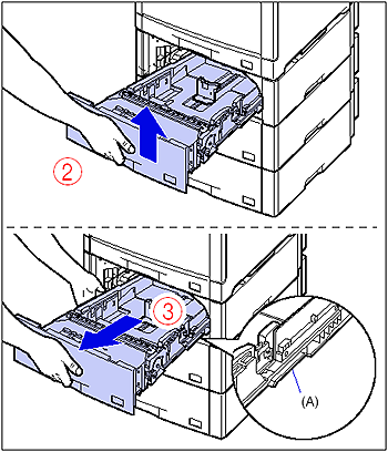 After lifting the front of the paper cassette up a little (2), pull it out while supporting the cassette with your left hand until the handle (A) on the right side of the paper cassette appears completely (3).