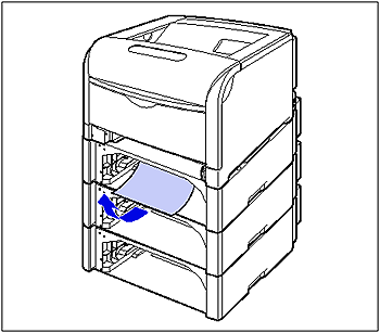 When a paper jam occurs during printing for some reason, the printer beeps, displaying the message <13 PAPER JAM> in the display. When a paper jam occurs, remove the jammed paper using the following procedure, and then resume the job. If the message that indicates the paper jam does not disappear even after removing the jammed paper following the procedure, there is a possibility that torn pieces of paper are still left inside the printer. Inspect each part of the printer again, and completely remove all pieces of jammed paper.