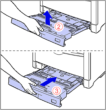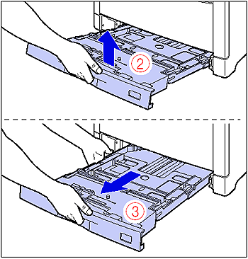 After lifting the paper cassette up a little (2), pull it out while supporting it with the other hand (3) as shown in the figures.
