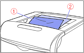 2. Check the output tray, then remove all the jammed paper (1) and output paper (2).
