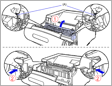 12. While holding the tabs (A), move the fixing unit back to its original position (1), and then press the tabs on the both sides as shown in the figure (2).