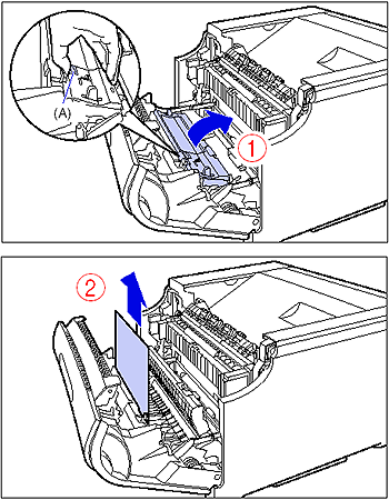 14. If the paper jam occurred when performing 2-sided printing, open the cover of the duplex print transport area while holding it by the tab (A) inside the front cover as shown in the figure (1), and then remove any jammed paper (2).