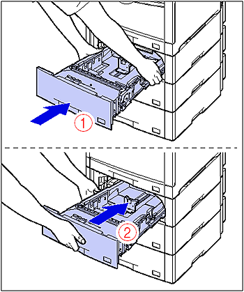 While holding the paper cassette with both hands, push it to the position shown in the figure (1). Then, hold the front of the paper cassette with your right hand and push it until it stops (2).