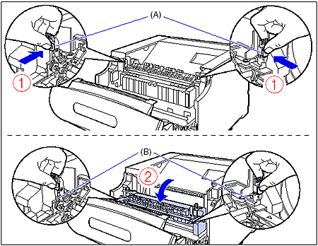 While pressing the green lock release buttons (A) on the left and right side of the fixing unit (1), hold the tabs (B) and tilt the fixing unit toward you (2) as shown in the figure.