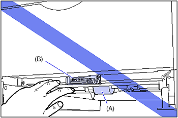 - Do not touch the paper feed roller (A) or switch (B) on the lower portion of the printer. This may result in damage to the printer or printer error.
