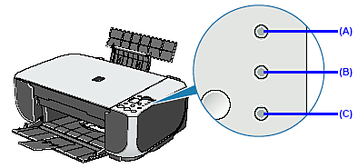 ![]() (A) The Alarm lamp lights. (C) The Ink lamp flashes. | If "E, 1, 6" is displayed on the LED, ink has run out. See "E, 1, 6" (Ink has run out.) in "An Error Code Is Displayed on the LED" and take appropriate action. If "E, 1, 3" is displayed on the LED, ink may have run out. See "E, 1, 3" (Ink level cannot be detected.) in "An Error Code Is Displayed on the LED" and take appropriate action. *The diagram on the left indicates the status of the Color FINE Cartridge as an example. |