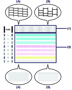 1. Check if there are no missing lines in the pattern (1) or no horizontal white streaks in the pattern (2).