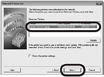 - If the machine is not detected, Check Printer Settings dialog box is displayed. Refer to the printed manual: Network Setup Troubleshooting. Make sure there is no problem, then click Next again on the screen in 8.