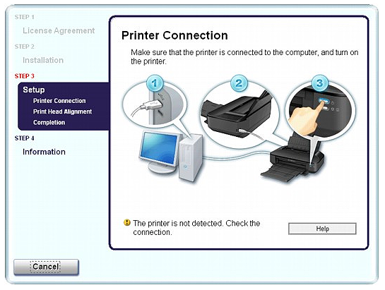 If you are unable to proceed beyond the Printer Connection screen, make sure that the USB cable is securely plugged into the USB port of the printer and is connected to the computer, and then follow the procedure below to reinstall the printer driver.