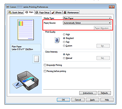 When you select Automatically Select from Paper Source, you can use the printer driver to select the paper source for plain paper.