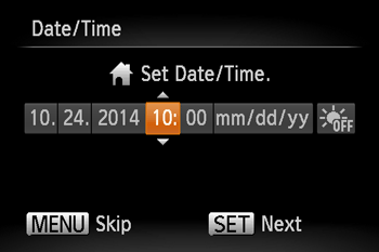Set the current date and time correctly as follows if the [Date/Time] screen is displayed when you turn the camera on. Information you specify this way is recorded in image properties when you shoot, and it is used when you manage images by shooting date or print images showing the date. You can also add a date stamp to shots, if you wish