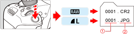 file extension .JPG for JPEG and .CR2 for RAW).