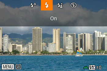 The instructions below refer to the setting that makes the [Flash] fire for each shot (On).