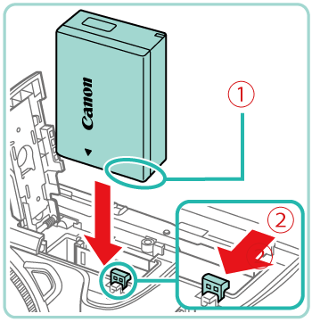 • Holding the battery pack with the terminals () facing as shown, move the battery lock down () and insert until the lock clicks shut.