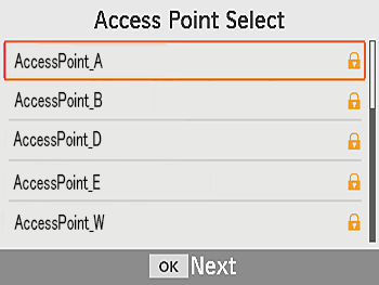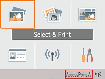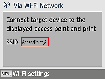 - Once the printer is connected to the access point, the screen at left is displayed. Check the indicated access point name and press the <