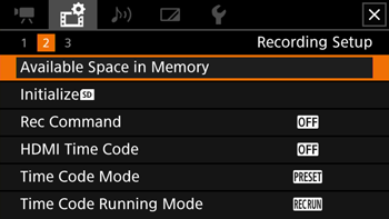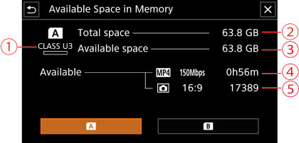 You can verify how much of the memory card is currently available for recording or how much is in use total recording time and total number of photos using [Available Space in Memory] / [Used Space in Memory]. You can also check the memory card's Speed Class.