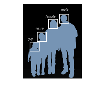 | Đầu ra | Output: CSV file, log Age : 0-2/ 3-9/ 10-19/ 20-29/ 30-39/ 40-49/ 50-59/ 60 or older (Unit : years old) Gender : Male/ Female *Nếu không thể ước tính được đối tượng (ví dụ: chỉ một mặt bên hiển thị và không thể phát hiện ra một khuôn mặt nhìn về phía trước), sẽ ghi nhận là Không có profile. * Đếm số người cho từng hồ sơ (Nhóm tuổi, Giới tính) và tổng hợp tại từng thời điểm cụ thể. | |