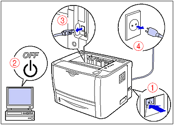 If a USB cable is connected, turn the computer off (2), and then disconnect the USB cable from the printer (3).