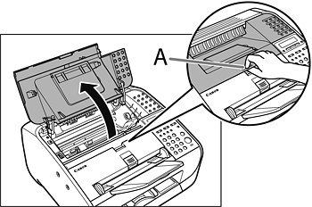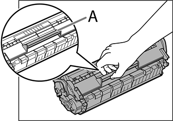 9. Insert the toner cartridge so that the guide (A) on the left side of the toner cartridge fits into the groove inside the machine and slide it down parallel to the guide.