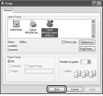 Select the printer icon for the machine ([Canon MF4200 Series UFRII LT]), then click [Preferences] or [Properties] to open the dialog box.