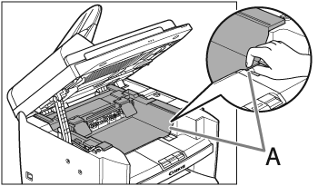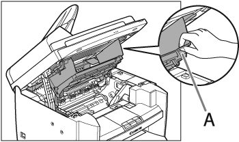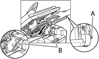 8. Insert the toner cartridge so that the protrusion on the right side of the toner cartridge (A) fits into the guide (B) located on the right side of the machine and slide it down parallel to the guide.