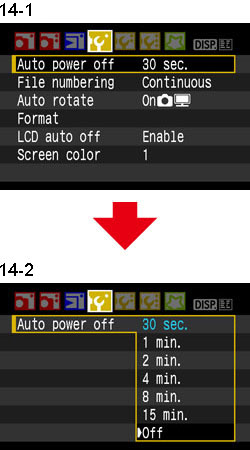 ] tab, and then press the <Cross Keys> to select [Auto power off].14-2. Press the <SET> button and press the <Cross Keys> to select [off], tnen press the <SET> button again.