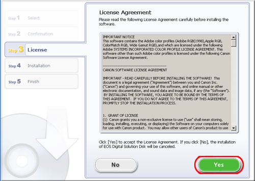 7. Check the details of the License Agreement, and then click [Yes] if you consent to all the conditions.