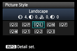 | Landscape | ![]() | For vivid blues and greens, and very sharp and crisp images. Effective for impressive landscapes. This Picture Style is also selected automatically when the Mode Dial is set to < >. |