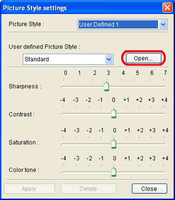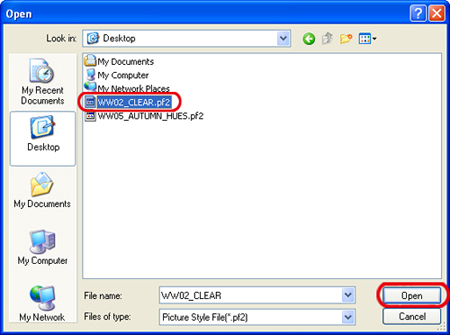 8. In the [Open] dialog box that appears, select the Picture Style file (with the ".pf2" extension) saved in the PC and click [Open].