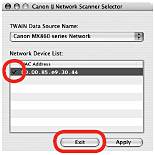 5. On the Canon IJ Network Scanner Selector screen, select Canon MX860 series Network in TWAIN Data Source Name and the MAC address of the machine in Network Device List, then click Apply to use the machine as a scanner.