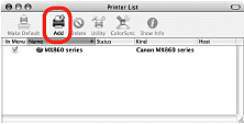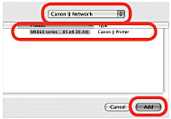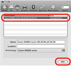 Select Canon IJ Network in the pop-up menu, select MX860 series in the list of printers, then click Add.