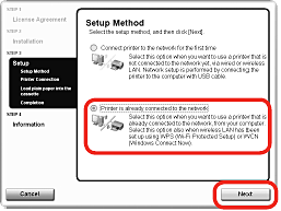 2. On the Setup Method screen, select Printer is already connected to the network, then click Next.