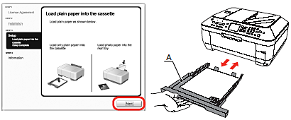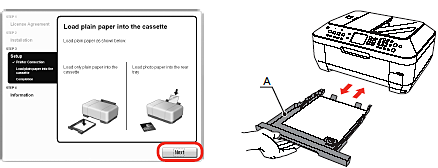 10. When the Load plain paper into the cassette screen appears, load plain paper in the Cassette (A) and click Next.