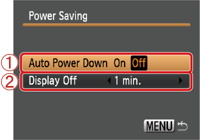 Operate the <directional buttons> left or right to set the [Auto Power Down] to [Off].