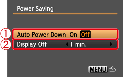 Operate the <directional buttons> left or right to set the [Auto Power Down] to [Off].