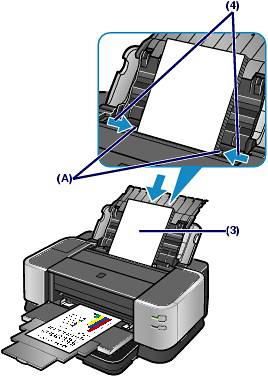 (3) Slide the Paper Guides (A) to open them, and load the paper in center of the Rear Tray WITH THE PRINT SIDE FACING YOU.