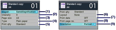 - The settings of the print quality, automatic intensity adjustment, etc. are retained, and these settings will appear next time when the copy mode is selected even if the power is turned off and on. The settings of the page size and media type are retained and shared among the copy mode, fax mode, card mode, and template print.