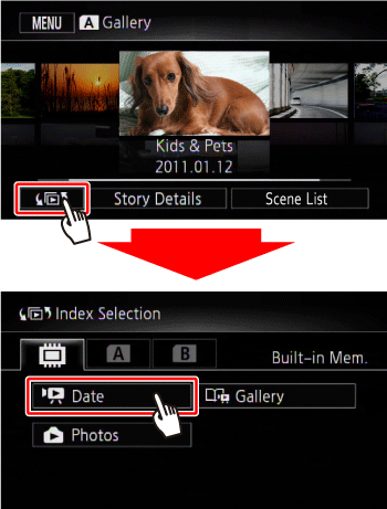 tab (memory card A). To convert all the scenes recorded on a specific date, drag your finger left/right until the desired date appears in the title bar.