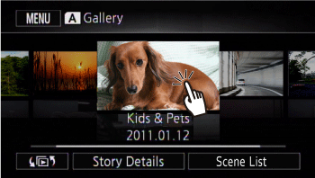 Display the gallery screen for the built-in memory or memory card slot A, from which data is converted, and touch the story.