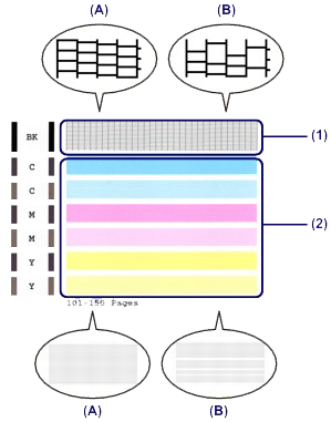 For (A) (no missing lines or no horizontal white streaks) in both the pattern (1) and pattern (2):