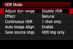 - The HDR mode cannot be set if you use any of the following: AEB, white balance bracketing, multiple exposures, bulb exposure, or movie shooting.