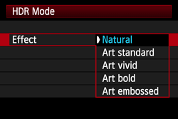 The types of effects that can be set for HDR shooting are as shown in the table below.